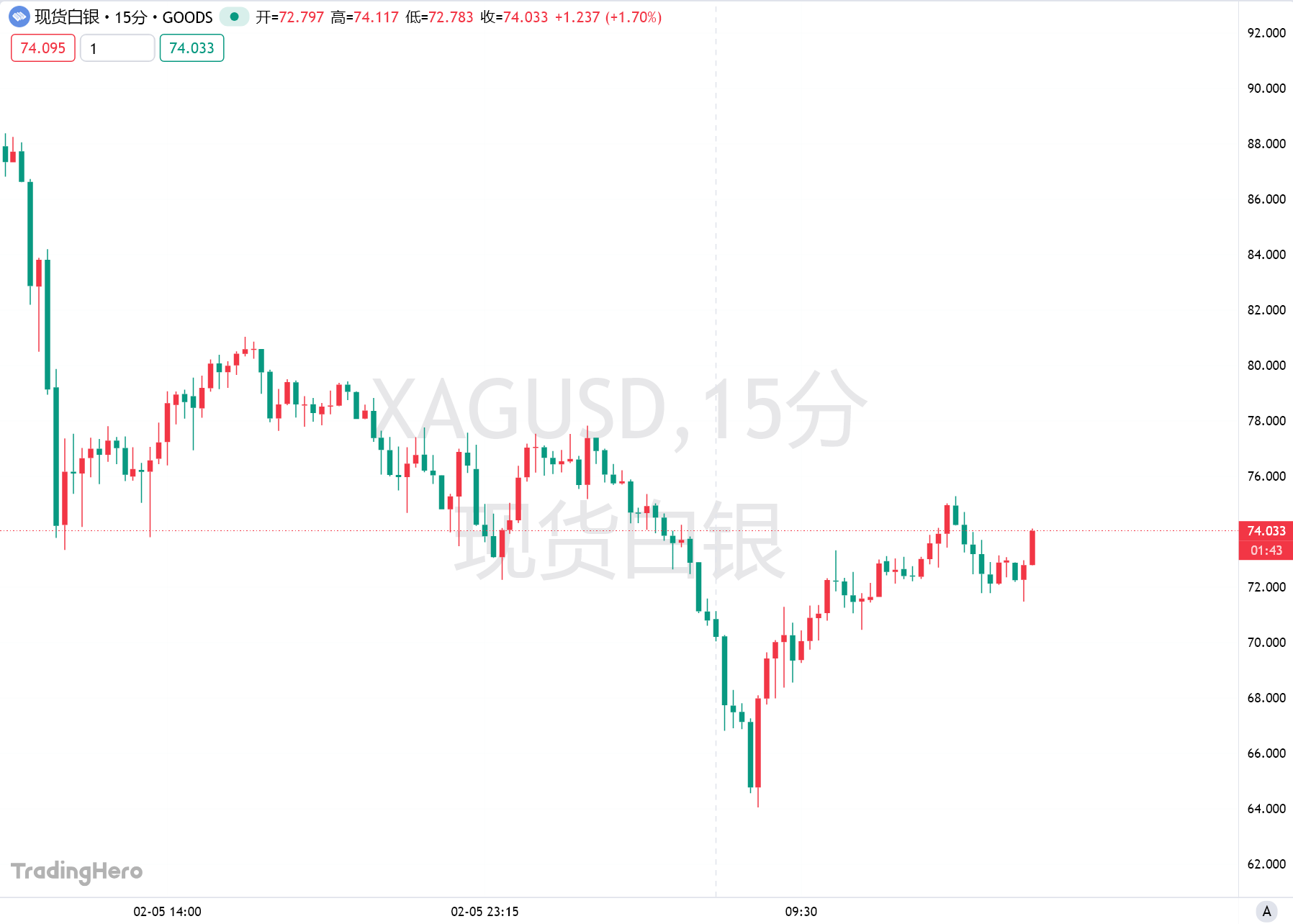 现货白银在周五亚洲交易时段最高涨幅达6.2%,此前一度跌至每盎司64美元。而在前一个交易日,白银价格重挫近20%,回吐了上月一轮惊人涨势带来的全部涨幅。黄金价格也在早盘回落之后迎来回升。
