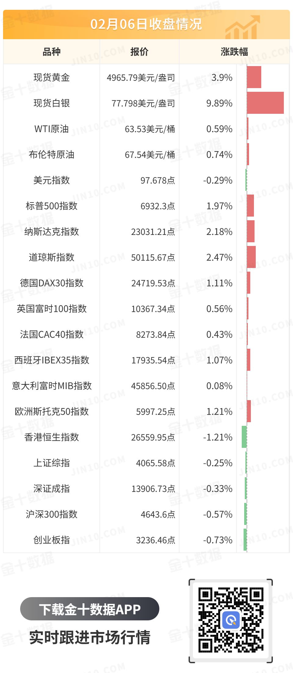 贵金属再度上演V型反转。芝商所第六次对金银期货上调保证金后, 现货黄金开盘走低,最低触及4655.57美元/盎司,随后持续上攻,较日低反弹超200美元,最终收涨3.9%,报4965.79美元/盎司;现货白银波动更加剧烈,盘中一度暴跌近10%并逼近64美元/盎司,随后快速收复失地,最终收涨9.89%,报77.798美元/盎司。