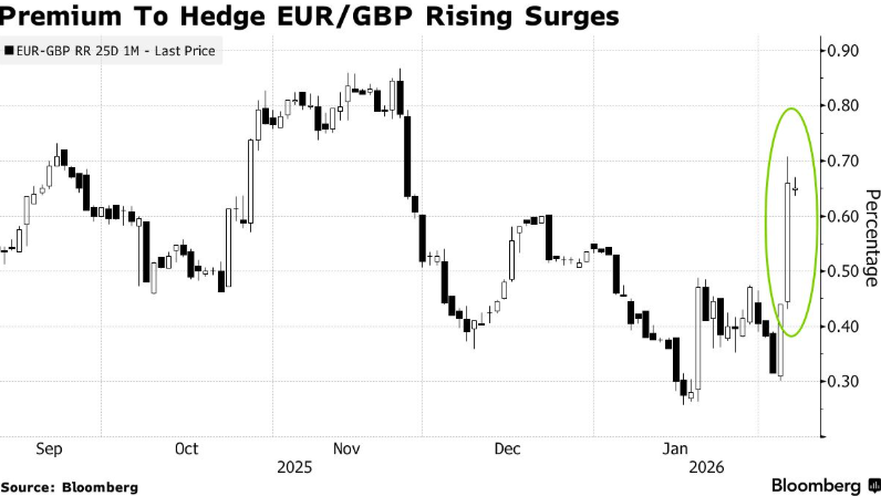 2月5日,对冲英镑兑欧元在未来一个月下跌(而非上涨)的风险溢价,跃升至去年11月底以来的最高水平。根据美国存管信托和结算公司的数据,欧元-英镑期权交易量同日亦攀升至年内高点。其中,看涨期权(即押注英镑兑欧元走弱)的交易量比看跌期权(即押注英镑走强)高出50%。