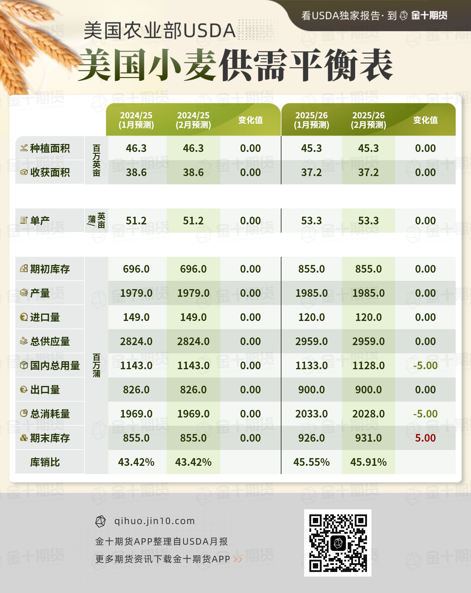 ①2月美国2025/2026年度小麦种植面积预期4530万英亩,1月预期为4530万英亩,环比持平;