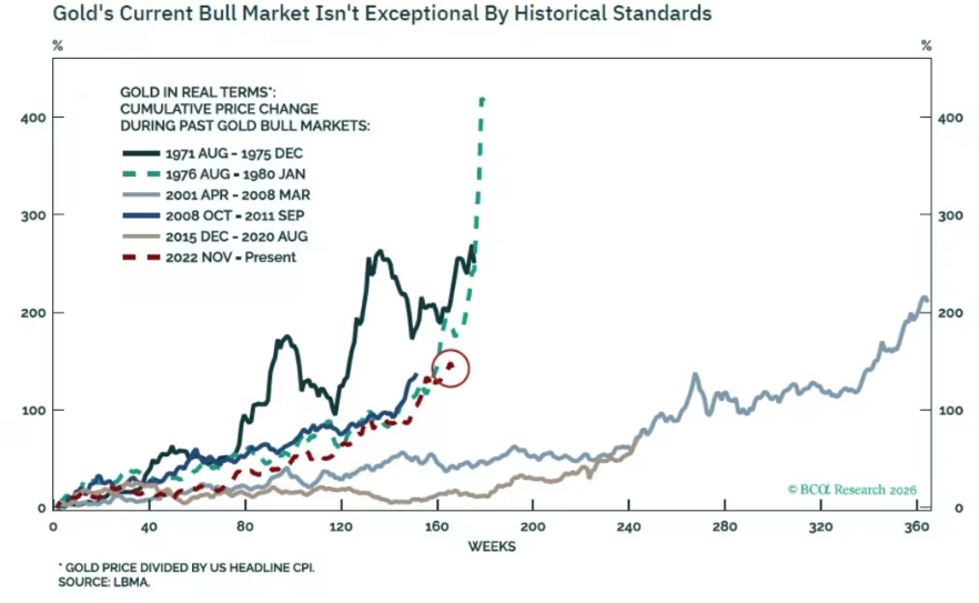 此外,她指出,当前黄金牛市“以历史标准看并不算异常”,涨幅落后于1971–1974年和1976–1980年的两轮大牛市。
