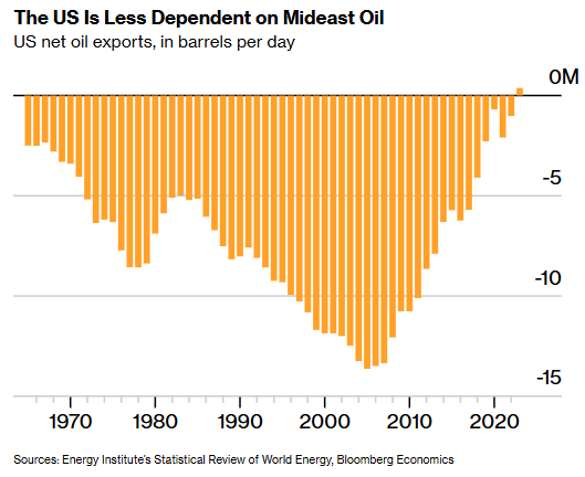对于世界最大经济体而言,石油冲击已不再像过去那样造成打击。页岩油使美国从伊拉克战争时期的主要进口国转变为出口国。这一转变将在原油价格飙升时缓冲经济增长,意味着对美国的影响将接近中性。