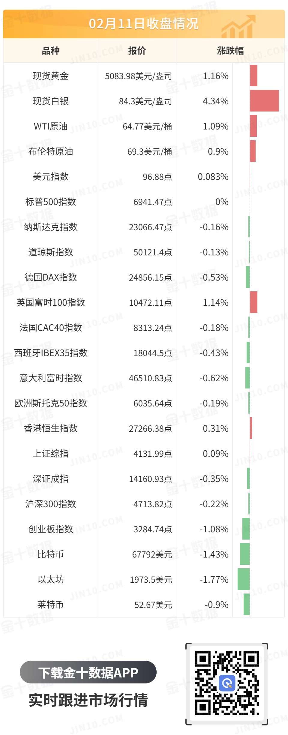 现货黄金在非农公布后跳水,但在央行稳定买盘和地缘政治因素的支撑下维持涨势,最终收涨1.16%,报5083.98美元/盎司;现货白银盘中站上86美元关口,最终收涨4.34%,报84.3美元/盎司。