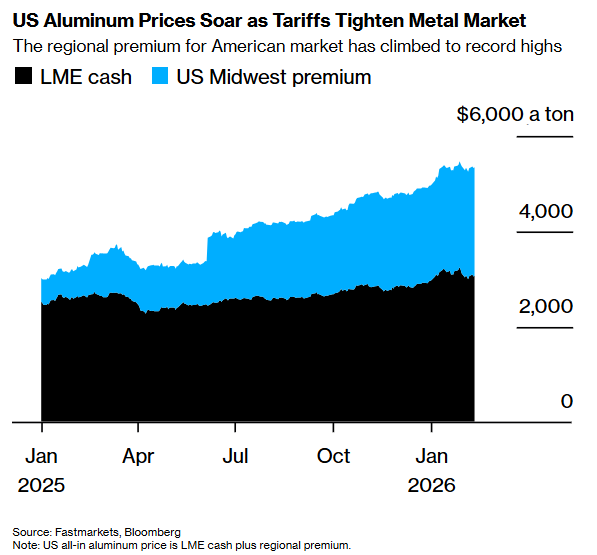 过去一年来,受关税影响,美国铝价涨幅持续跑赢全球市场。Fastmarkets数据显示,所谓“美国中西部溢价”——即在全球基准价格基础上将铝运送至该地区的附加费用——周三攀升至每磅1.03美元的历史峰值。自去年6月初50%进口关税生效以来,该溢价已翻倍有余。