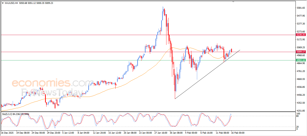 Economies.com的分析师今日最新观点:国际现货黄金在近期日内交易中下跌,试图重新组织阵型并获得新的动能,以帮助其突破5000美元的关键心理阻力位。由于价格稳定在50日均线上方,依托关键动态支撑,短期内保持了小幅看涨波的主导地位,特别是其交易持续沿着支撑性趋势线进行。另一方面,相对强弱指标与价格走势相比,正过度接近严重超买水平,表明可能形成负面背离,这将对未来交易构成压力,并阻碍完成复苏。