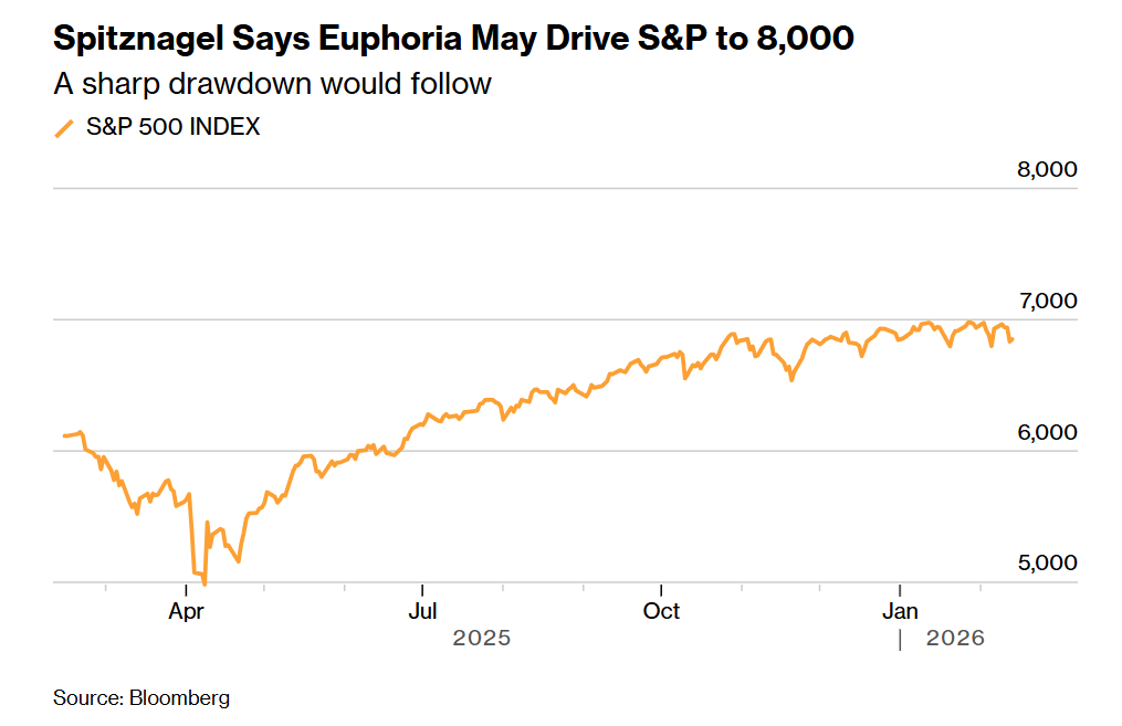 斯皮茨纳格尔旗下的对冲基金已有近二十年历史,专注于尾部风险对冲,即保护投资者投资组合免受下一次重大崩盘的冲击。他表示,只要经济保持韧性,股市就将继续上涨——这一观点他自2022年末以来一直坚持。他在接受采访时称,市场狂热可能推动标普500指数涨至8000点甚至更高——随后将出现剧烈反转。周二,该指数收于6843.22点。