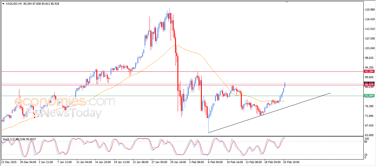 Economies.com的分析师今日最新观点:现货白银价格持续上涨,冲击我们此前分析中的86.00阻力位目标。这表明价格依然处于看涨情景之中,买盘兴趣不断增强,并受到坚实的技术结构支撑,这进一步提升了短期内现货白银延续上涨行情的可能性。