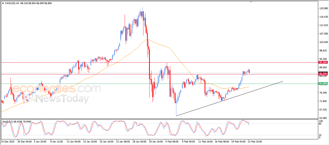 Economies.com的分析师今日最新观点:国际现货白银在上一个交易日内出现有限的回调走势,这属于此前看涨浪潮后的自然获利了结阶段,并未改变整体技术面前景。价格稳定交投于50日指数移动平均线(EMA50)上方,获得看涨支撑,同时短期内的小型看涨浪持续,表明看涨情景至今仍然有效。此次回调旨在缓解相对强弱指标(RSI)的超买状况,随着其出现负面信号,在重启上涨走势前重新平衡动能。因此,价格稳定于动态支撑位上方,将增强其在未来一段时间内反弹并延续涨势的机会。