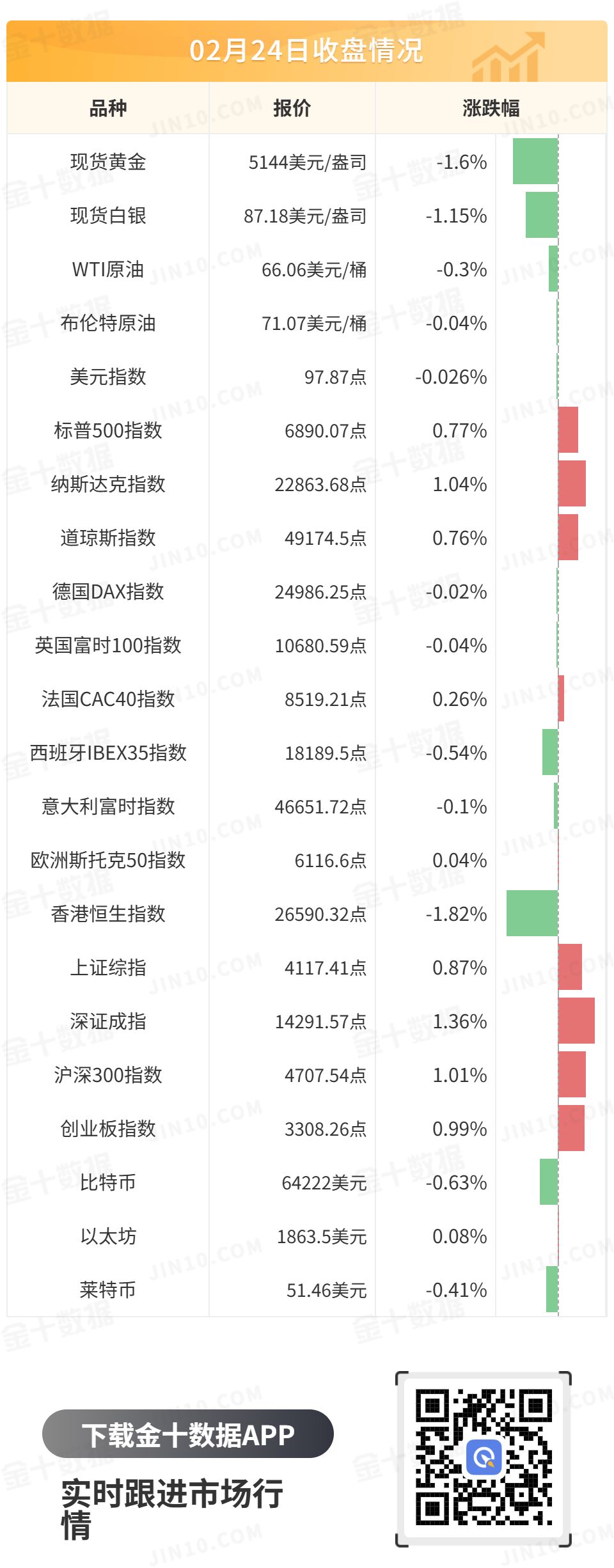 受美元维稳以及投资者在前期涨势后获利了结的影响,国际现货黄金价格从5250附近的近三周高点回落,日内一度跌超100美元,最终收跌1.6%,报5144美元/盎司;现货白银最终收跌1.15%,报87.18美元/盎司。