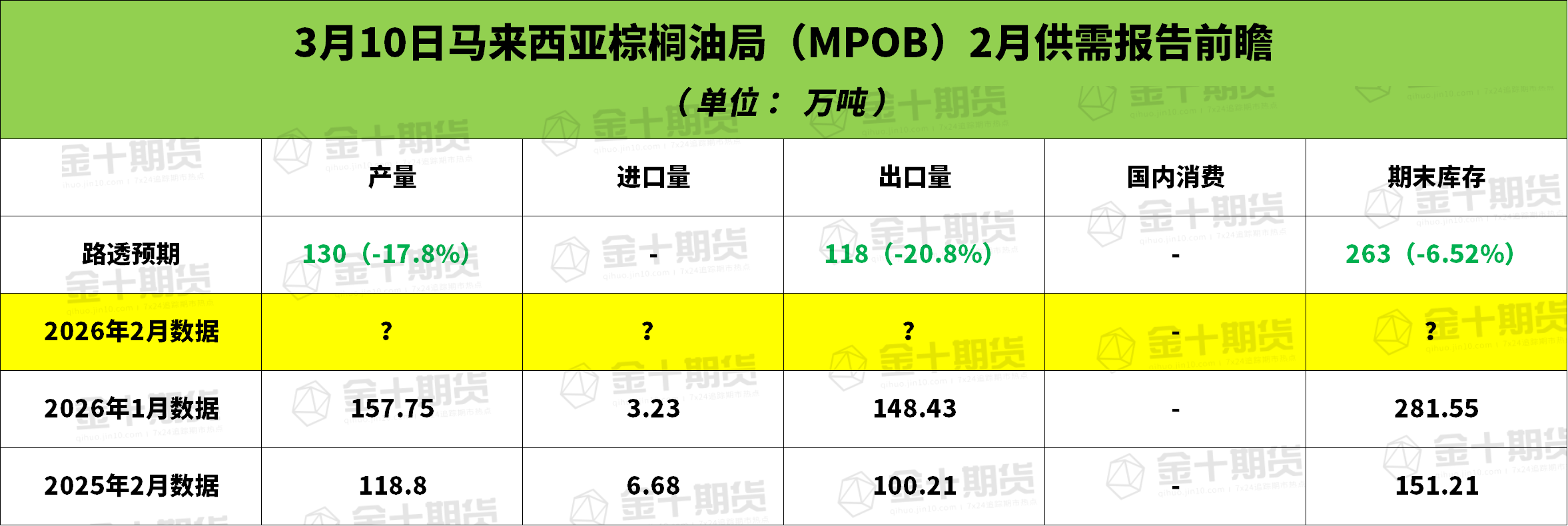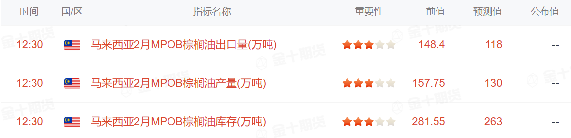 马来西亚棕榈油局(MPOB)将于北京时间3月10日(周二)中午12:30发布2月份马棕油供需数据。