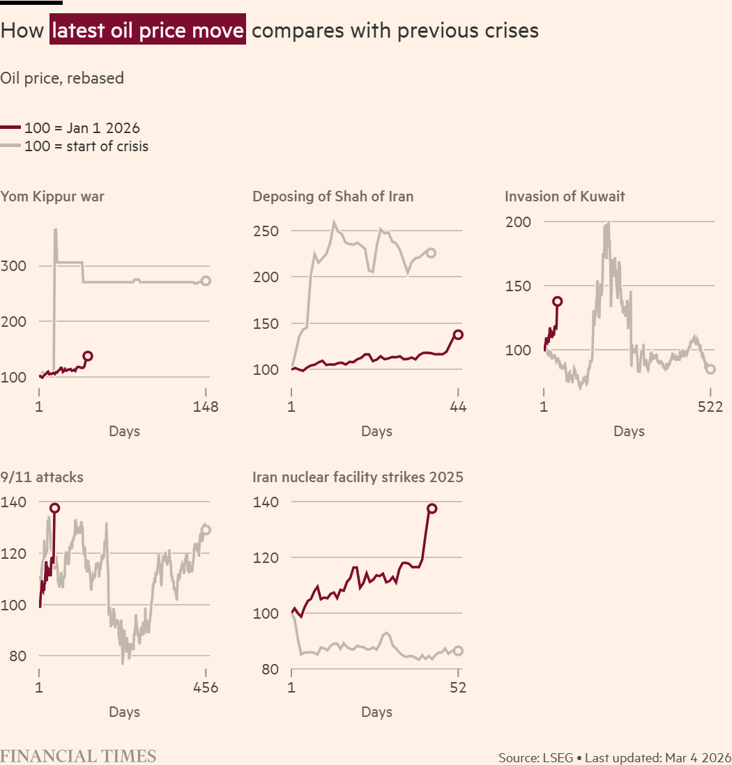 冲突进入第六天,这一情景中的大部分已经成为现实——但原油价格并未像预测那样迅速突破具有象征意义的每桶100美元关口。