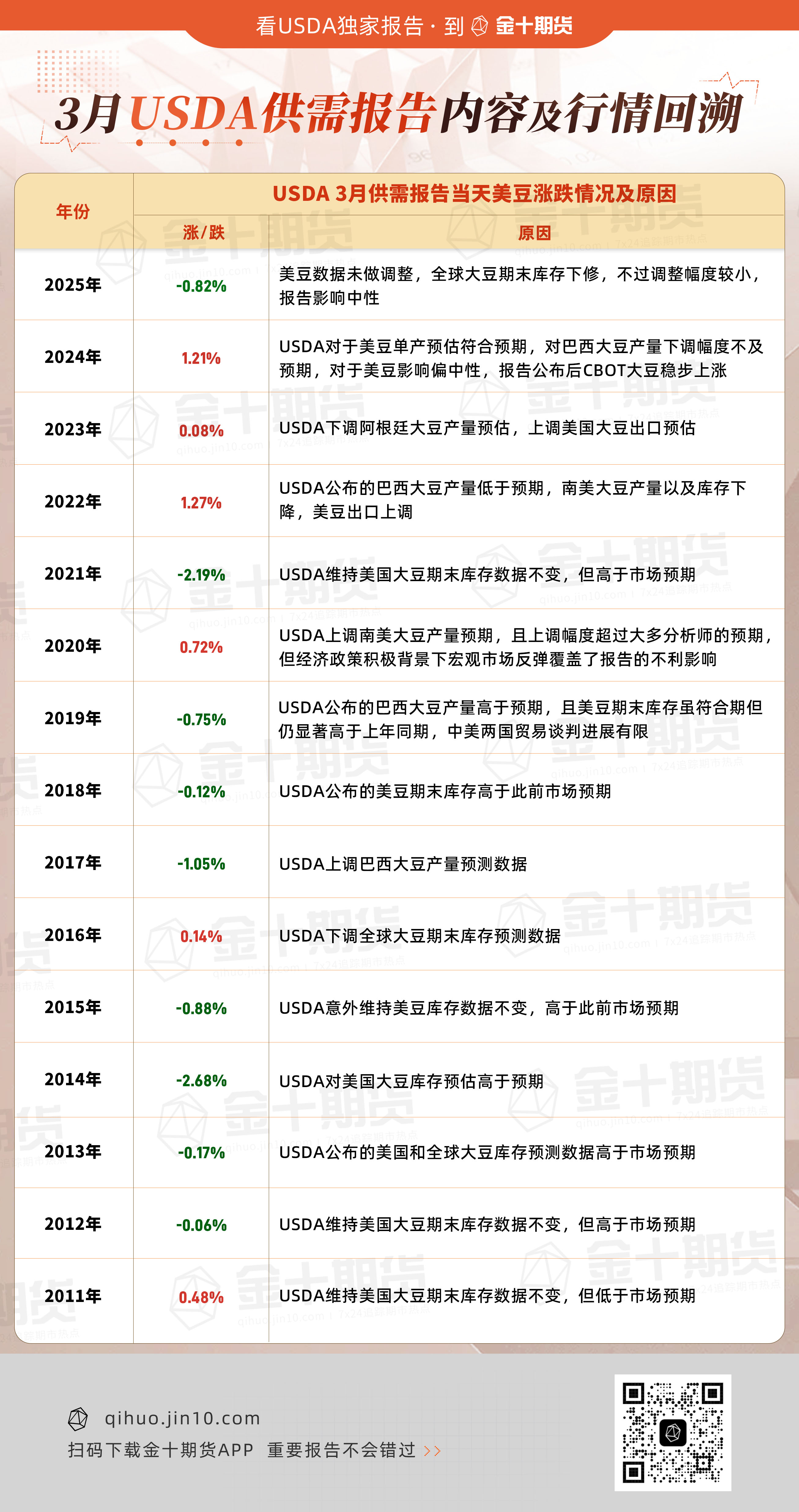 USDA将于北京时间3月11日(周三)凌晨0点公布3月供需报告(点击查看金十期货日历)。往年美国农业部(USDA)3月报告与2月报告类似,美豆供应端维持不变,更可能在需求端进行调整。2025/2026年度美豆产量在当年2月至9月的供需报告中一般保持不变。