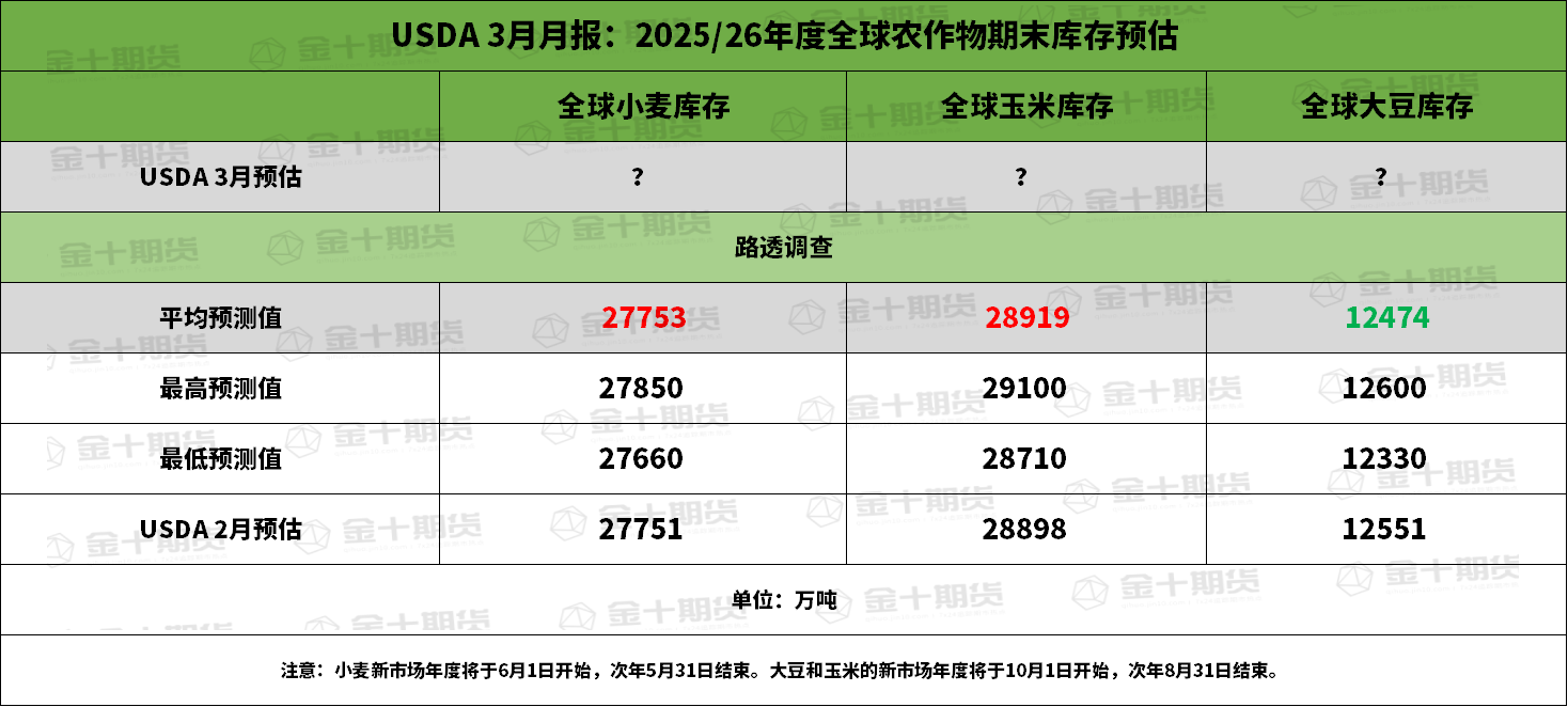 ② 全球2025/26年度玉米期末库存料为2.8919亿吨,预估区间介于2.87-2.91亿吨,USDA在2月报告中预估为2.8898亿吨。