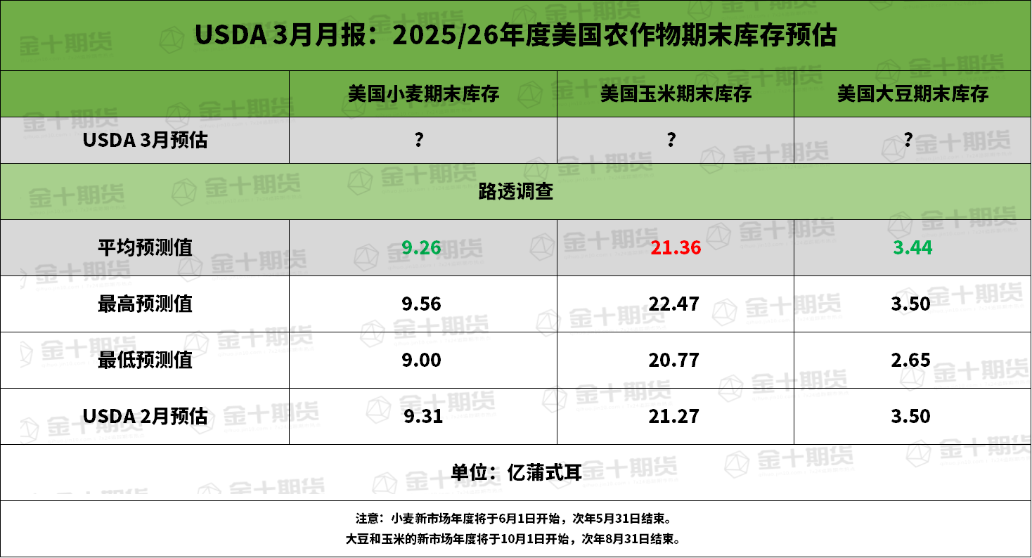 ② 美国2025/26年度玉米期末库存料为21.36亿蒲式耳,预估区间介于20.77-22.47亿蒲式耳,USDA在2月报告中预估为21.27亿蒲式耳。