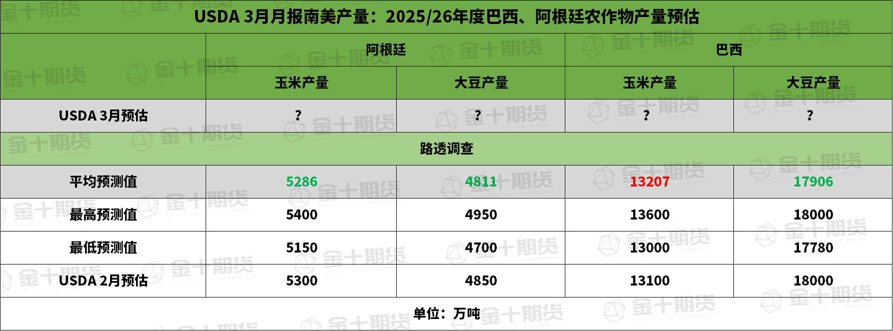 ① 阿根廷2025/26年度玉米产量为5286万吨,预估区间介于5150-5400万吨,USDA在2月报告中预估为5300万吨。