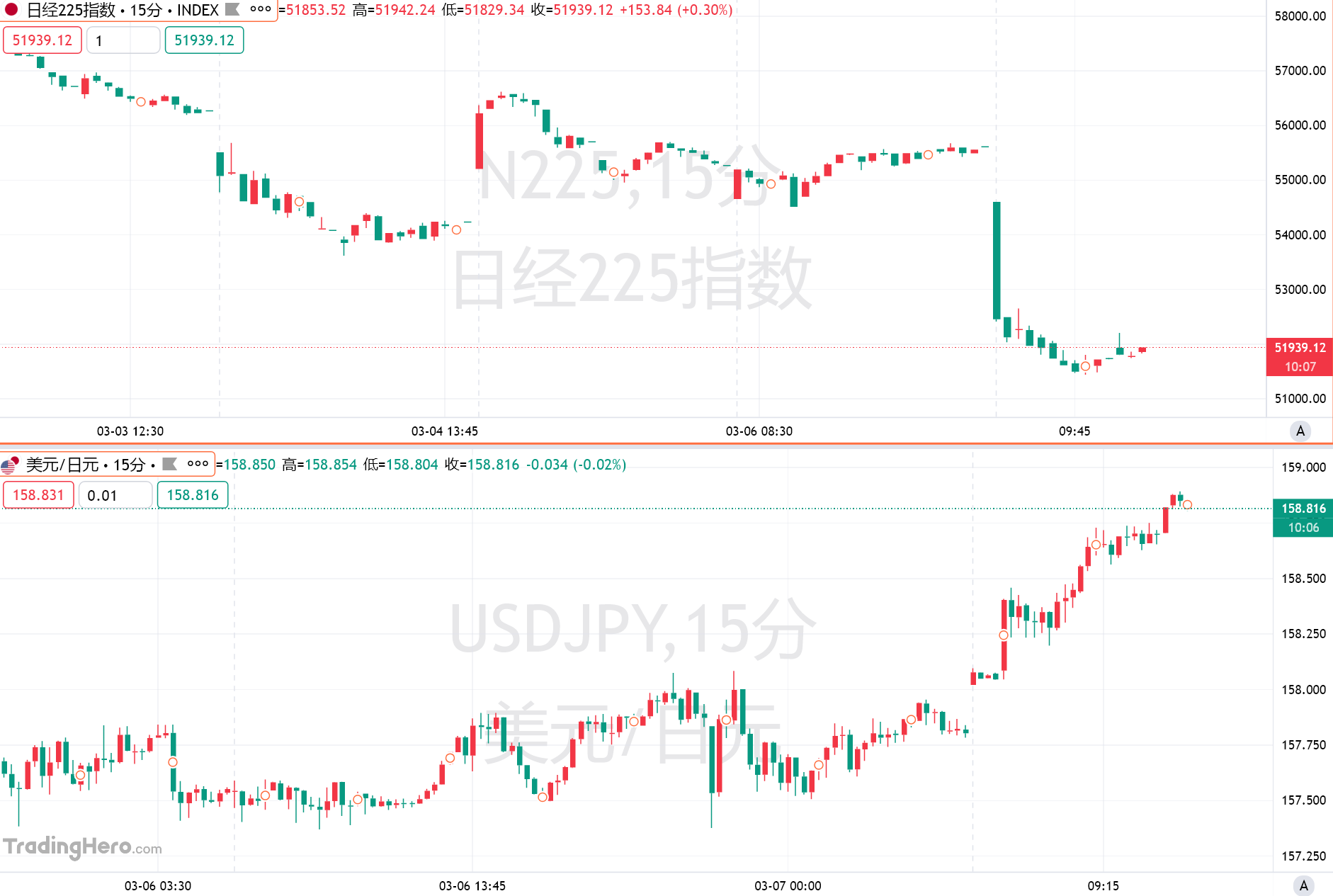 随着中东敌对行动升级,以及石油运输和全球能源基础设施面临的压力不断扩大,油价周一突破每桶110美元。日元兑美元汇率走弱,逼近160的关键关口——这是2024年当局介入支撑日元时的水平。日本股市也大幅下挫,日经225指数周一早盘一度下跌约7%,而长期债券收益率上升。