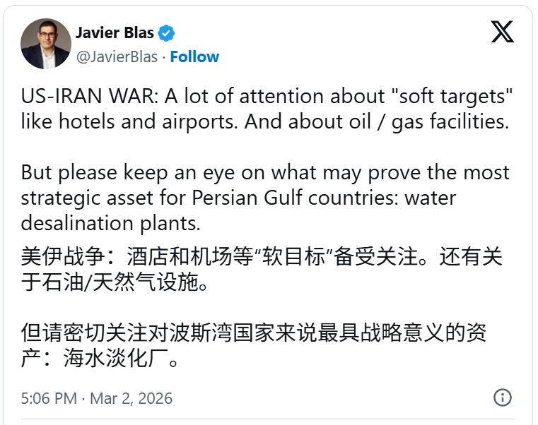 这一风险最早于上周早些时候由彭博大宗商品分析师哈维尔·布拉斯(Javier Blas)提出,他表示:“很多人关注酒店和机场等‘软目标’,也关注石油/天然气设施。但请密切关注可能被证明对波斯湾国家最具战略价值的资产:海水淡化厂。”