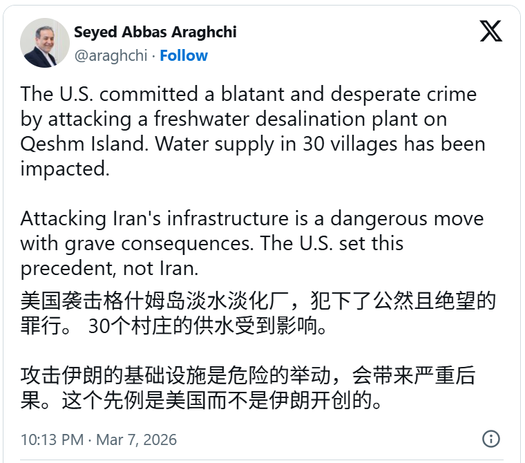 上周六上午,阿拉格齐在X平台上发帖称,美国军队“犯下了袭击格什姆岛一座淡水海水淡化厂的公然绝望罪行”。