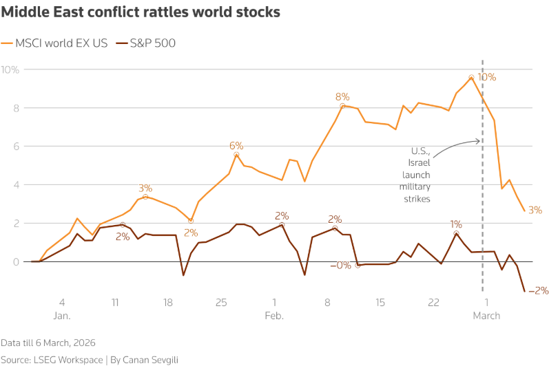 不出所料,美国市场在相对表现上更为坚挺。上周,标普500指数下跌了2%,相比之下,欧洲股市大跌了5.5%,而MSCI亚太(除日本外)指数更是重挫了6.3%。