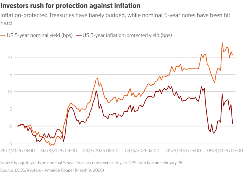 受此推动,自2月底以来,英国的五年期盈亏平衡通胀率(即通胀挂钩债券与名义债券收益率之间的差值)上升了28个基点。周一,该数据触及了近3.5%的水平,创下去年4月以来的新高。