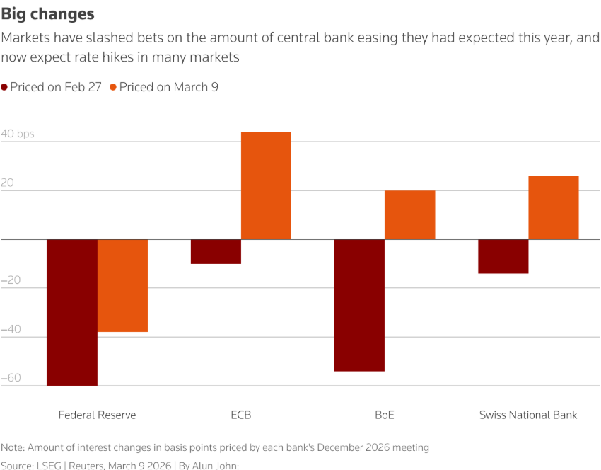 市场目前预计,欧洲央行今年至少会加息一次;而在冲突爆发前,市场原本认为有40%的降息概率。