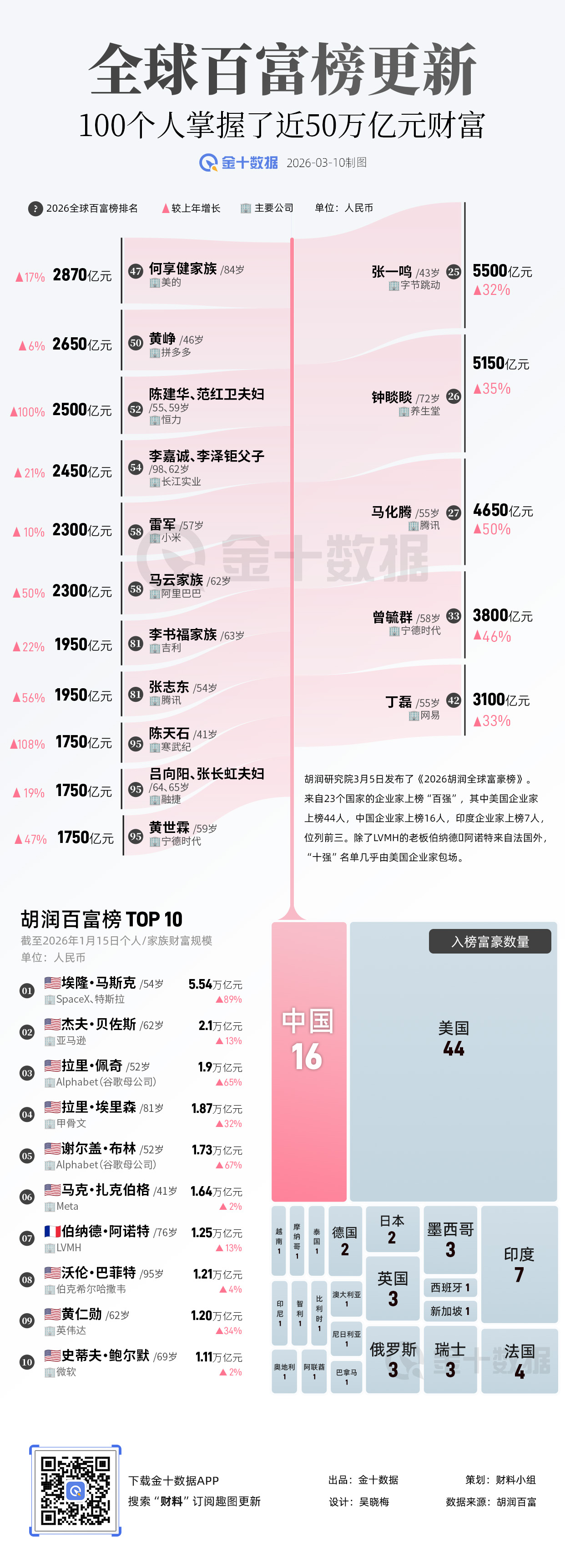 4小时前 全球百富榜更新!100人掌握了全球50万亿元财富|财料