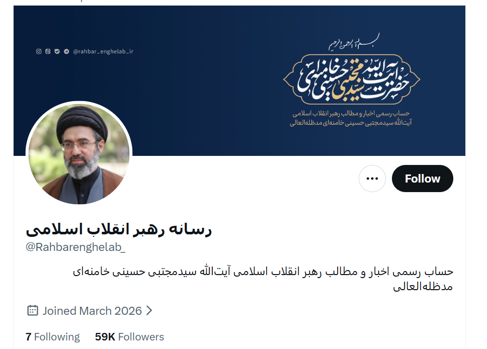 穆杰塔巴的X账号为@Rahbarenghelab_,他周四在该账号发表了一系列推文,就美国和以色列对伊朗发动的战争以及该伊斯兰共和国对此的回应发表了看法。