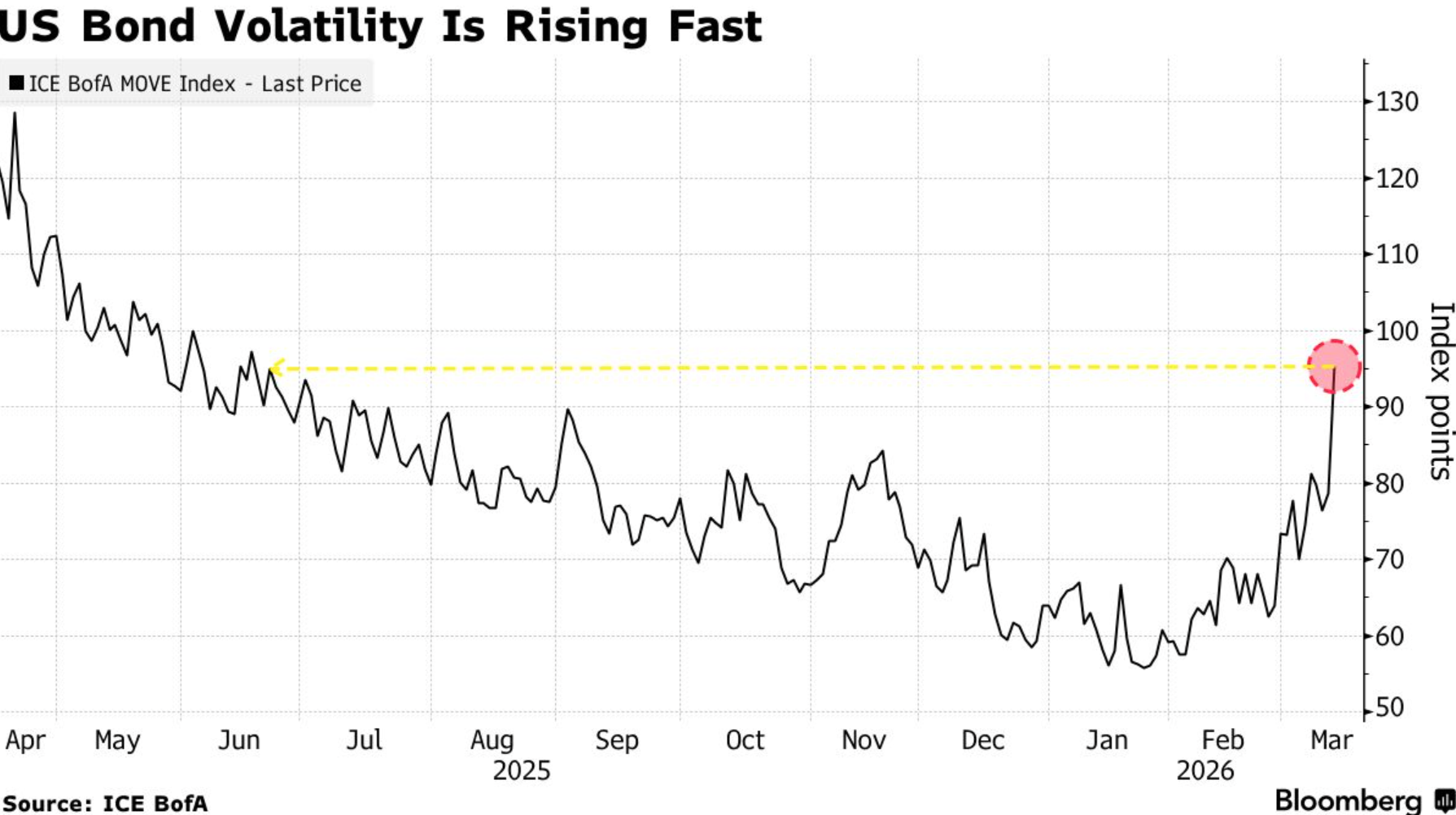 ICE BofA MOVE指数(常被称为债券市场的“恐惧指数”)攀升至去年6月以来的水平,因油价上涨加剧通胀担忧,损害了美国国债的实际回报并削弱了其避险吸引力。