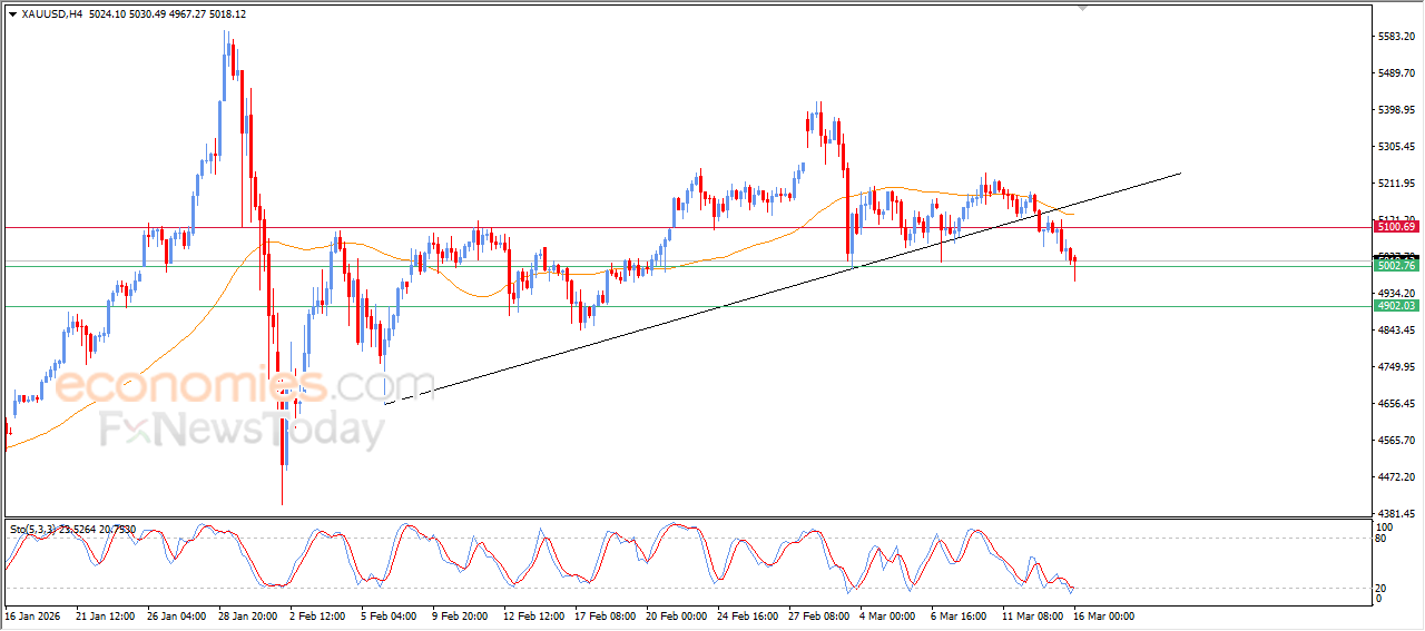 现货黄金价格在最新的日内交易中持续下跌,触及了5,000美元这一主要且具有心理意义的关口,该位置正是我们此前分析中所预期的目标。此次下跌受到了短期内小型上升趋势线被跌破的影响,同时,现货黄金持续运行在EMA50均线下方所带来的负面压力也在延续。