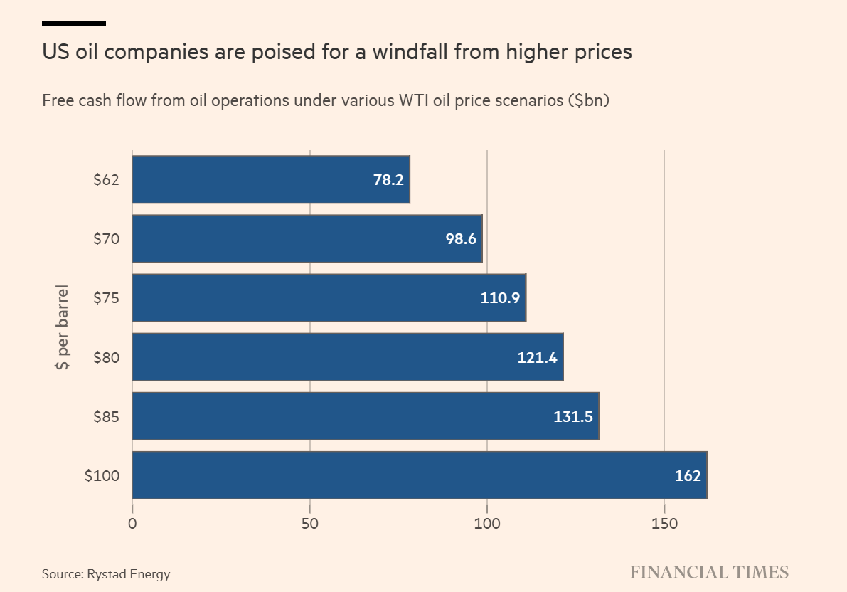 投行杰富瑞(Jefferies)模型测算,自2月28日冲突爆发、油价上涨约47%后,仅本月美国生产商就将新增50亿美元现金流。能源研究公司Rystad预计,若美国原油全年均价达100美元/桶,企业将从石油生产中额外获得634亿美元收益。