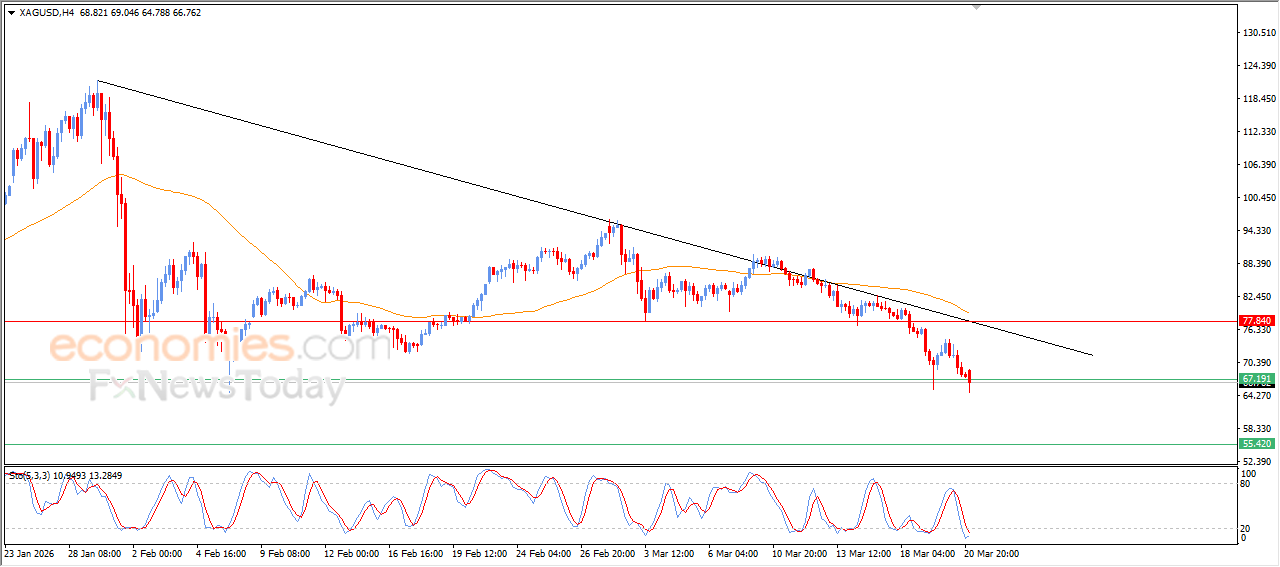 Economies.com的分析师今日最新观点: 现货白银在最新的日内交易中出现下跌,接近跌破67.00美元的支撑位,该支撑位此前在我们的分析中被视为价格目标。这一走势表明,现货白银可能面临持续的负面压力。当前的表现反映出短期内主要空头趋势占据主导,价格走势沿着该方向的支撑趋势线运行。同时,现货白银价格持续在EMA50均线下方交易,进一步加大了负面压力,增强了未来一段时间内继续下跌的可能性。