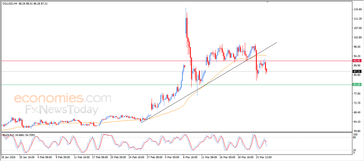 Economies.com的分析师今日最新观点: 布伦特原油期货价格下跌,主要受制于持续的负面压力,原因在于价格运行于EMA50均线下方。短期内,空头修正浪依然占据主导地位,这一走势受到此前主要上升趋势线被跌破的影响。同时,在价格成功缓解超卖状态后,相对强弱指标(RSI)也开始释放出新的负面信号,这将加剧未来一段时间内的下行压力。