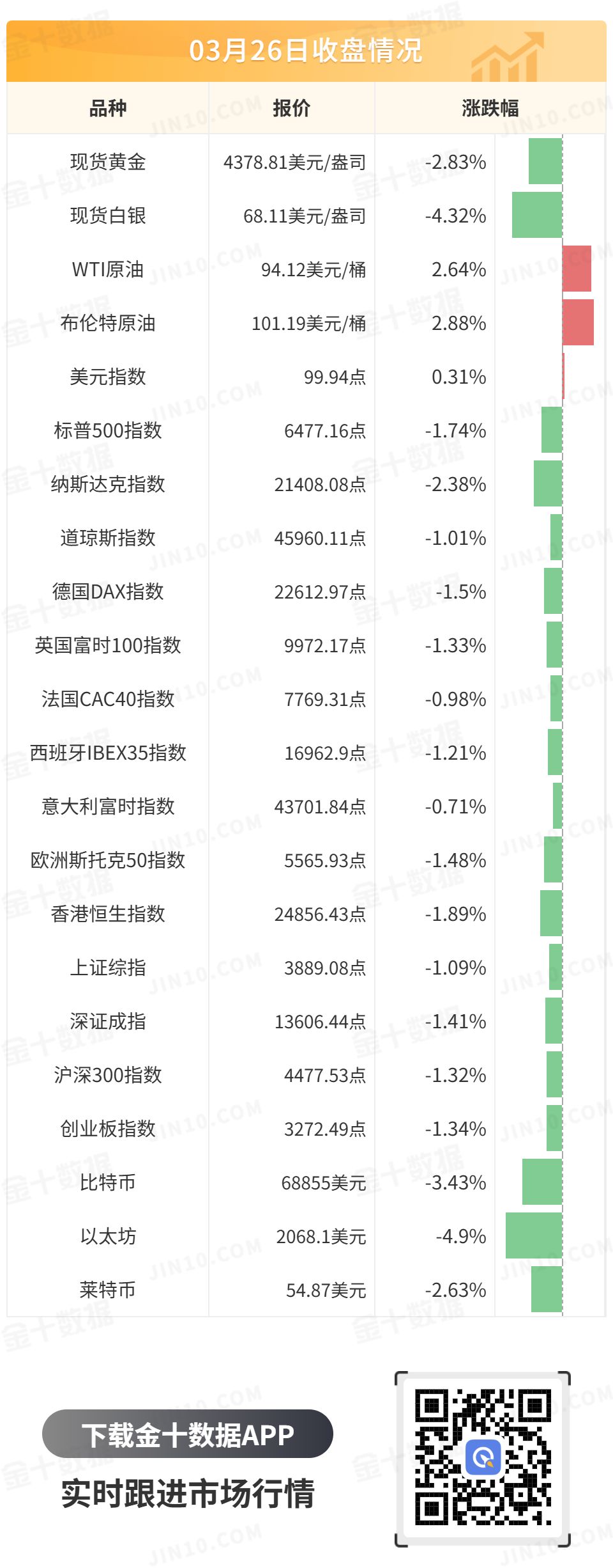 现货黄金重启跌势,最低触及4351.14美元/盎司,在特朗普将打击伊能源设施时间推后10天后,短线一度拉升超60美元,最终收跌2.85%,报4377.95美元/盎司;现货白银最终收跌4.32%,报68.11美元/盎司。