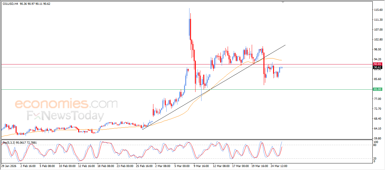 Economies.com的分析师今日最新观点: WTI原油期货价格在近期日内交易中保持了此前的涨幅,尽管在短期内已跌破主要的多头趋势线,这对价格走势产生了负面影响。由于价格运行在EMA50均线下方,原油价格依然面临负面且动态的压力,这降低了短期内持续反弹的可能性。本轮上涨得到了相对强弱指标(RSI)所释放的积极信号的支撑,然而,当前RSI已达到严重超买水平,相较于价格走势而言,显示出正向动能正在逐步减弱,这可能威胁到未来一段时间内涨势的延续。