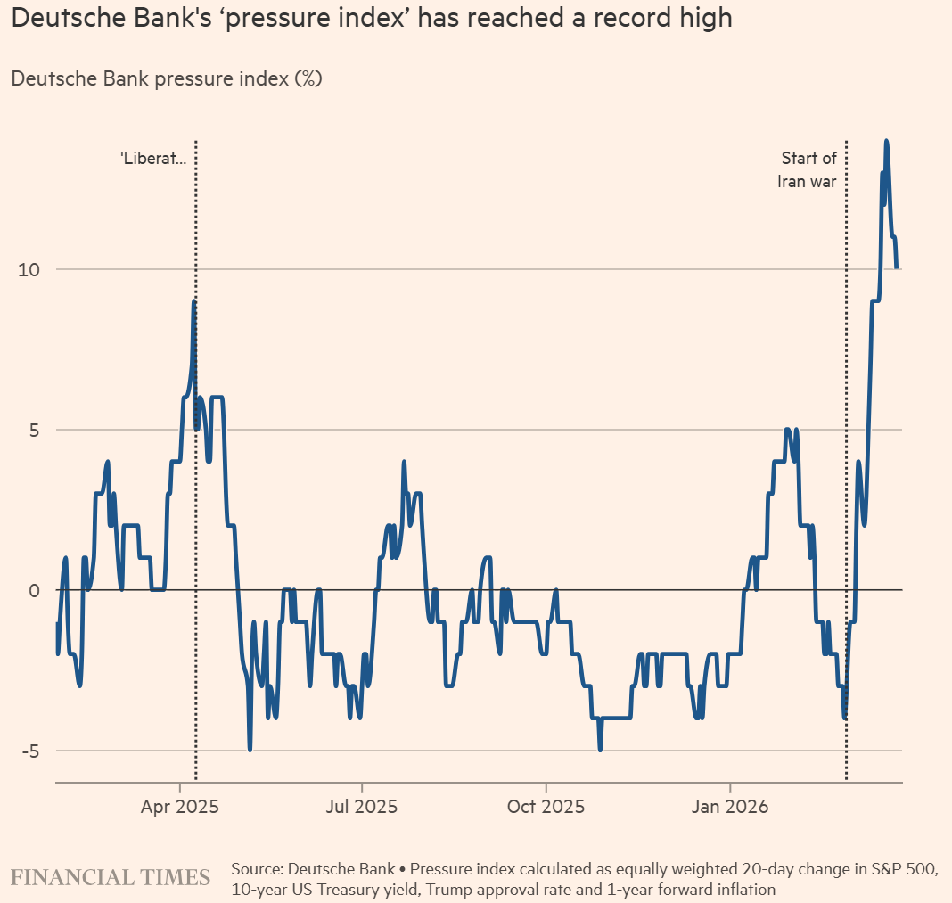 揣测下一个“TACO时刻”何时到来已成为华尔街最新的痴迷。德意志银行跨资产策略主管马克西米利安·乌勒(Maximilian Uleer)本周开发了一个“压力指数”,作为“美国即将到来的言论或战略调整的代理指标”。