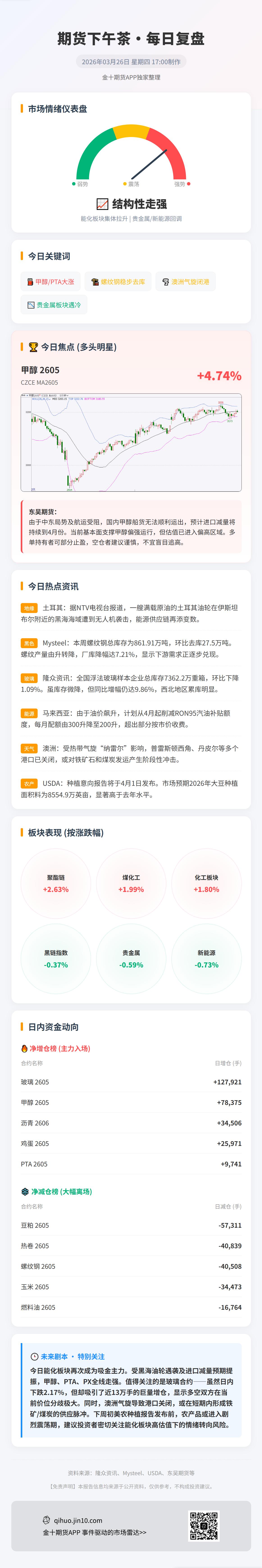 东吴期货表示,伊朗拒绝美国15点停火计划,地缘风险溢价再度回升,当前地缘局势复杂多变,盘面波动加大,需注意仓位控制。目前伊朗Bushehr(165万吨/年)甲醇装置停车,沙特沙比克甲醇装置(共计480万吨/年)开工低位,前期的空袭对轰的确造成了一定的供应减损(伊朗应该是气田遭袭后的天然气断供,沙特则是人员疏散后的预防性降负)。虽然中远海控恢复海湾国家订舱,但恢复航线涉及的港口均不是波斯湾内的港口,公司表示仍无直航进入霍尔木兹海峡的计划,与之前达飞集团的方案类似,因此还不能说霍尔木兹海峡的物理性封锁状态已解除。在甲醇船货无法顺利运出的情况下,国内进口甲醇的减量至少要持续到4月份,在此阶段甲醇仍偏强势。考虑到情绪性影响以及甲醇的估值已经偏高,前期已经建议多单部分止盈,剩余部分底仓可继续持有。没有头寸者谨慎对待,不建议追高。
