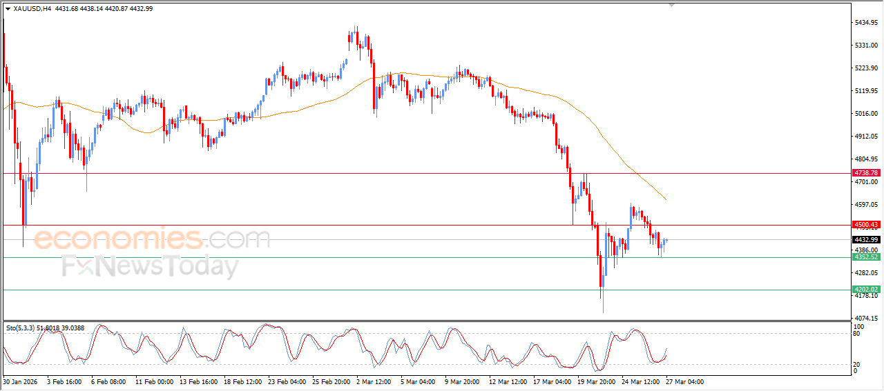Economies.com的分析师今日最新观点:近期,国际现货黄金小幅上涨,受益于价格反弹突破初始目标4350美元的支撑位,这为金价提供了积极的上涨动能,使其收复部分失地,并试图缓解相对强弱指标(RSI)上的超卖状况,同时一些新的积极信号也为其提供了支撑。尽管出现了这种暂时的改善,但主要的短期趋势仍然是看跌的,因为价格继续面临低于EMA50的下行压力,限制了短期内全面复苏的可能性。