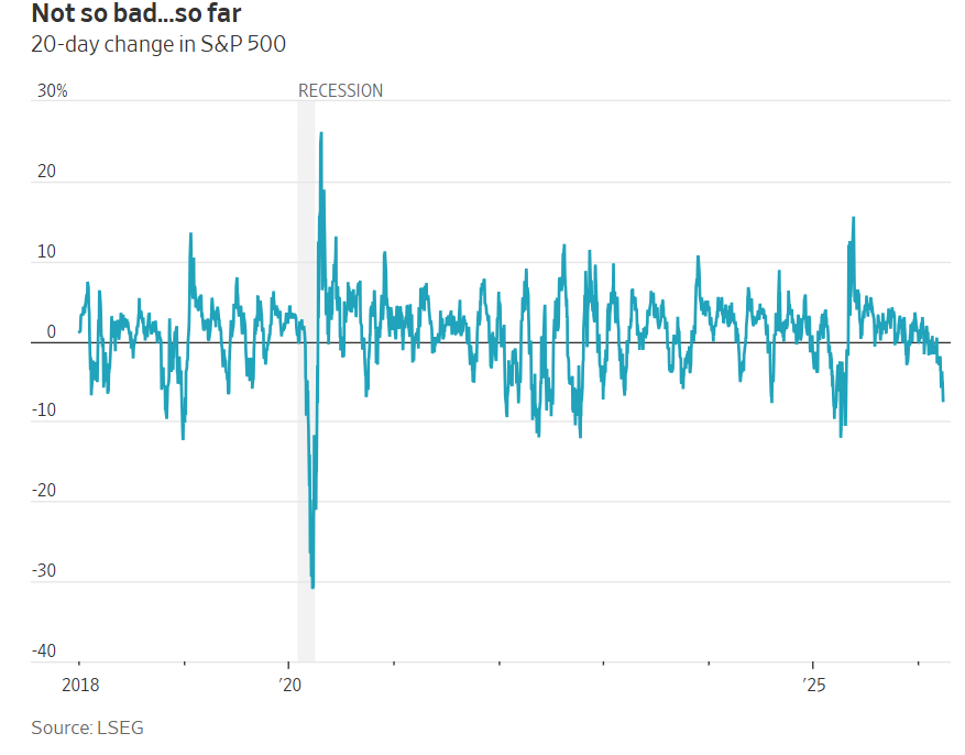 不过就目前而言,考虑到动荡的严重程度,市场跌幅其实有限。标普500指数较战前高点下跌7.4%,仅略高于2019年5月或2018年4月同期的跌幅——这两次下跌都完全不值一提。在一场已导致部分亚洲国家实施燃油配给的全球能源危机中,持谨慎态度的人认为,投资者已经过于自满。