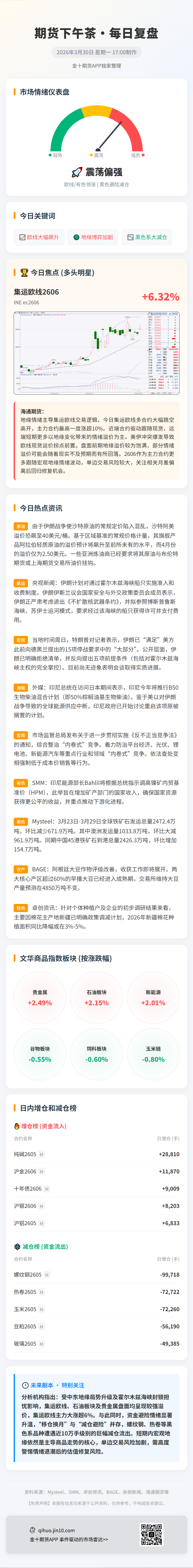 光大期货表示,从供需增速平衡角度分析,受地缘局势冲击,2026年全球集运市场供需结构有所收紧。预计2026年全球集运市场运力与吞吐量增速分别为3.2%和2.5%,运力增速超过需求增速约0.7个百分点,同比2025年以及此前预期均出现收紧。短期中东区域航线暂停、船舶绕行增加成本的影响是一方面,整体扰动以区域性、结构性为主;中长期更需要注意的风险在于能源价格大涨对全球通胀水平和经济产生的负面影响。在淡季现货运价涨幅有限的制约下,预计近月合约受地缘局势带来的边际扰动将进一步降低;远月合约则暂时受地缘预期变化扰动明显,或维持高波动率,绝对价格受燃油成本支撑的逻辑暂时仍将高位运行。5月之后,随着需求旺季到来,预计期现价格仍有进一步上行空间,关注航司宣涨情况及地缘局势变化的影响。