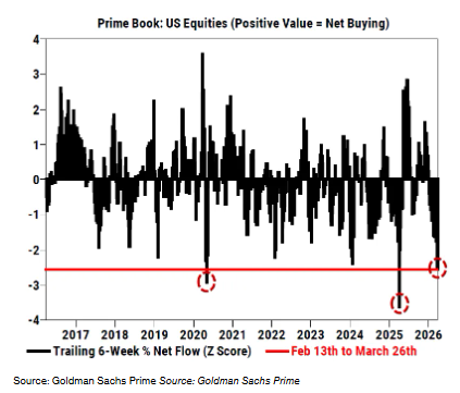 从过去六周的滚动数据来看,美国市场的净抛售规模位居过去十年来的第三高。他们表示,这波抛售力度已经逼近新冠疫情爆发时的恐慌性抛售水平,不过仍不及2025年4月的“解放日”抛售事件。