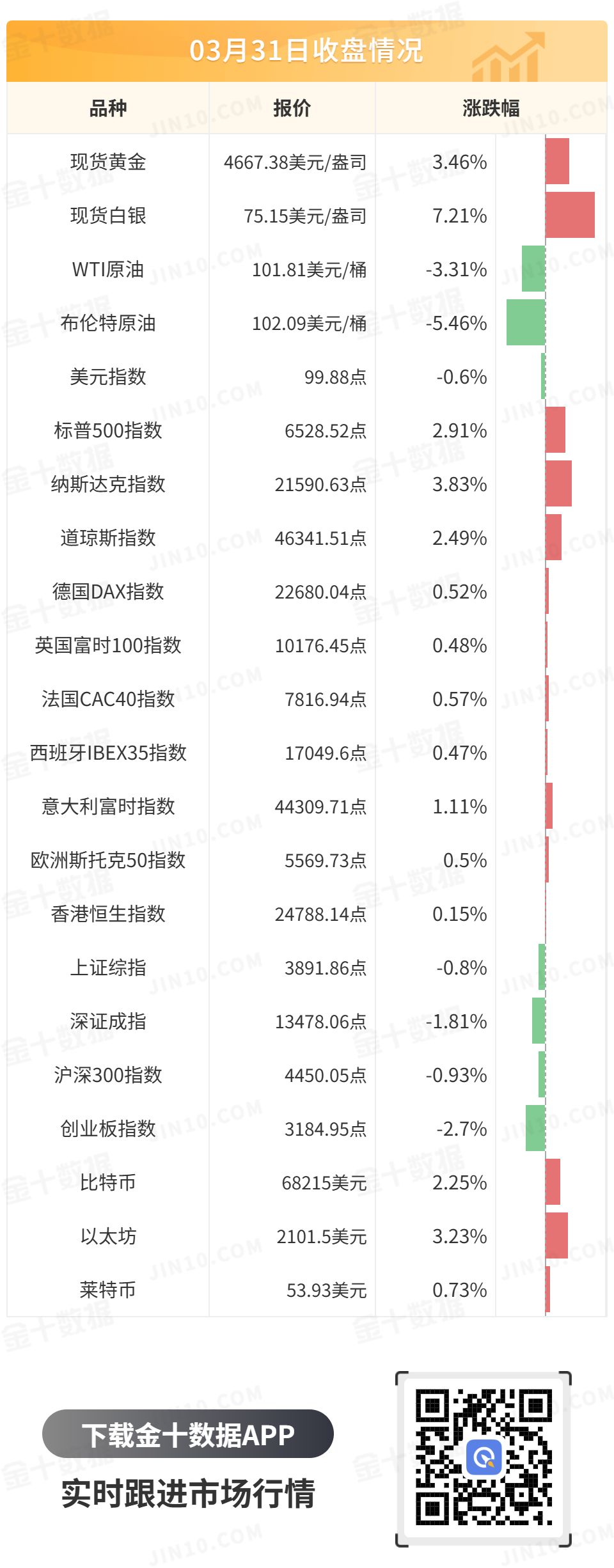 随着市场寄望于中东冲突能迅速结束,现货黄金延续反弹,日内涨超150美元,最终收涨3.46%,报4667.38美元/盎司,但仍录得2008年10月以来最差单月表现;现货白银站上75美元关口,最终收涨7.21%,报75.15美元/盎司,但录得2011年9月以来最差单月表现。