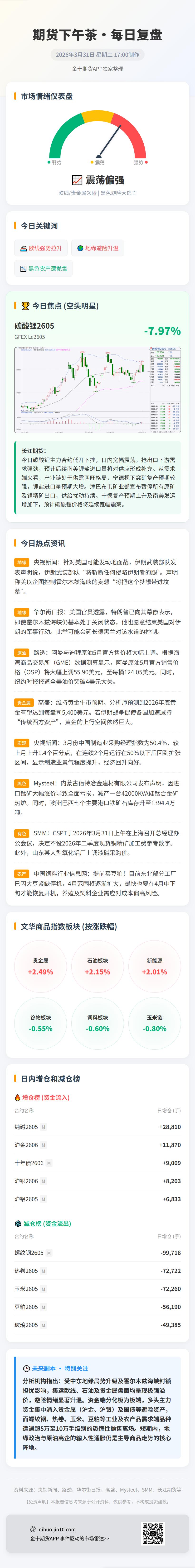 光大期货指出,地缘政治方面,白宫称特朗普希望4月6日前达成协议,美伊对话持续且进展顺利,伊朗否认谈判。近期金融市场表现出偏矛盾心理,一是美政府连续TACO下,对美伊冲突定价开始疲劳,但另一方面担忧美伊冲突骤然升级。对黄金来说,金价短期可能仍会经历反复的探底和筑底过程,但这可能为投资者提供战略性配置良机。对于银铂钯而言,中短期基本面供求逻辑让渡于宏观定价,价格跟随“龙头”黄金价格上下波动,但这也是银铂钯价值“去伪存真”的理性回归过程,关注美伊冲突在二季度被充分定价或黄金重新企稳反弹后的配置机会。
