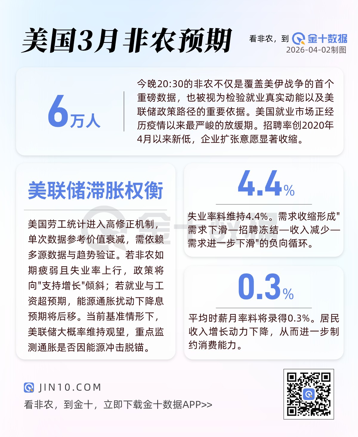 2小时前 美国3月非农预期:预计新增6万就业,失业率料维持4.4%