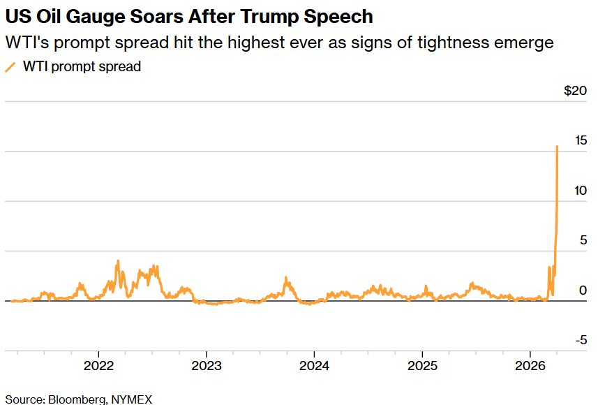 美国总统特朗普誓言将继续轰炸伊朗数周后,美国原油近月交割合约周四录得历史上相对于次月合约的最大溢价。