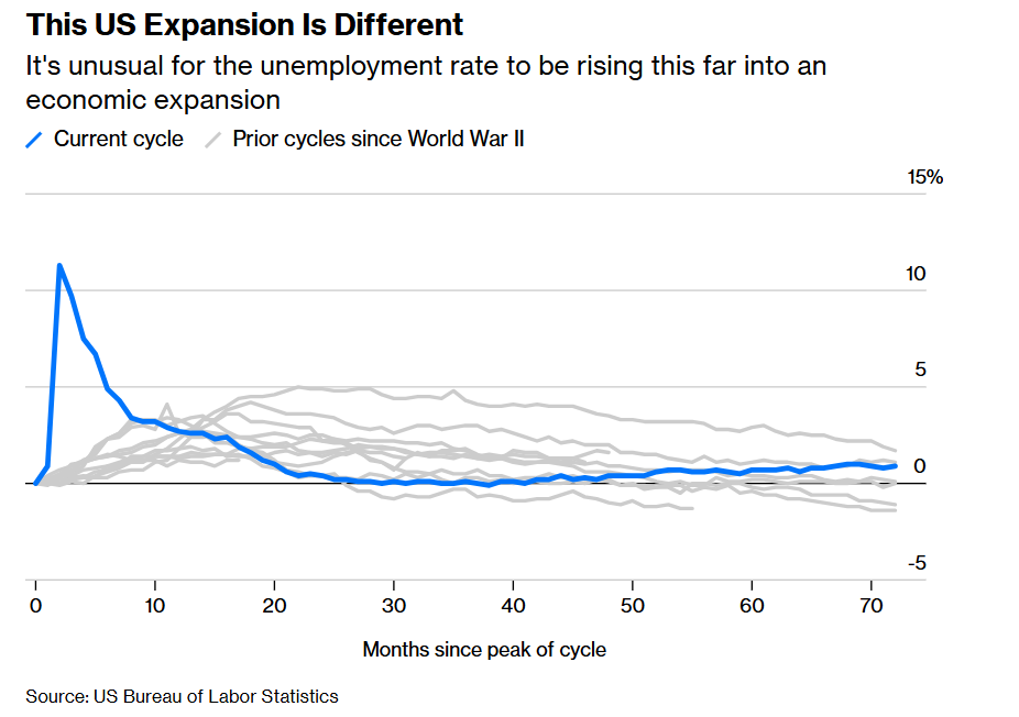 这一脆弱性已显露无遗。美国失业率较2023年低点已上升近一个百分点。尽管增幅较为平缓,但已足以推动美联储实施两次降息。当前失业率的上升路径在历史上极为罕见:本轮经济复苏中的失业率走势(蓝线),与二战以来所有复苏周期(灰线)均形成鲜明对比。