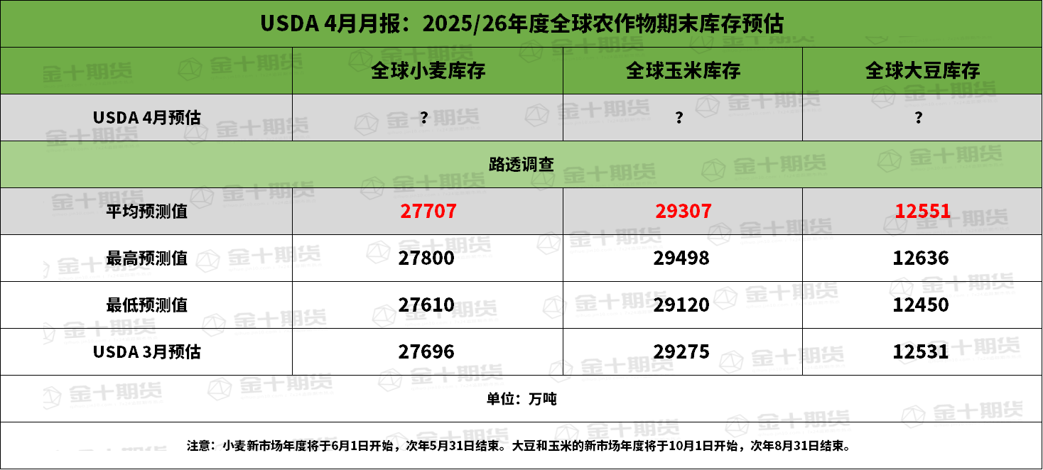 ③ 全球2025/26年度小麦期末库存料为2.7707亿吨,预估区间介于2.761-2.780亿吨,USDA在3月报告中预估为2.7696亿吨。