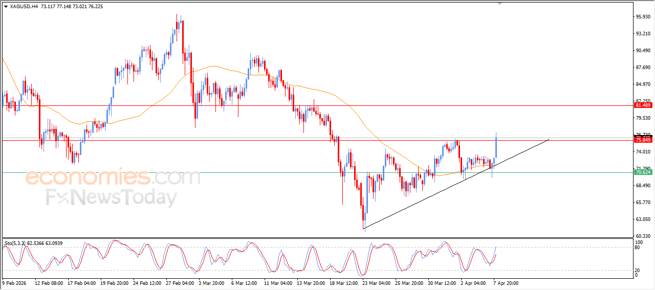现货白银在近期的日内交易中大幅上涨,取得显著涨幅,并成功突破关键阻力位75.85美元,这是此前分析的首选目标。这一强劲表现正值短期修正多头浪潮中,价格波动持续,伴随着支撑性趋势线,强化了这条积极路径的稳定性。价格在EMA50上方交易时,依然受益于动态支撑,同时相对强弱指标持续传递积极信号。这反映了强劲的多头动能,支持短期内持续多头走势的可能性。