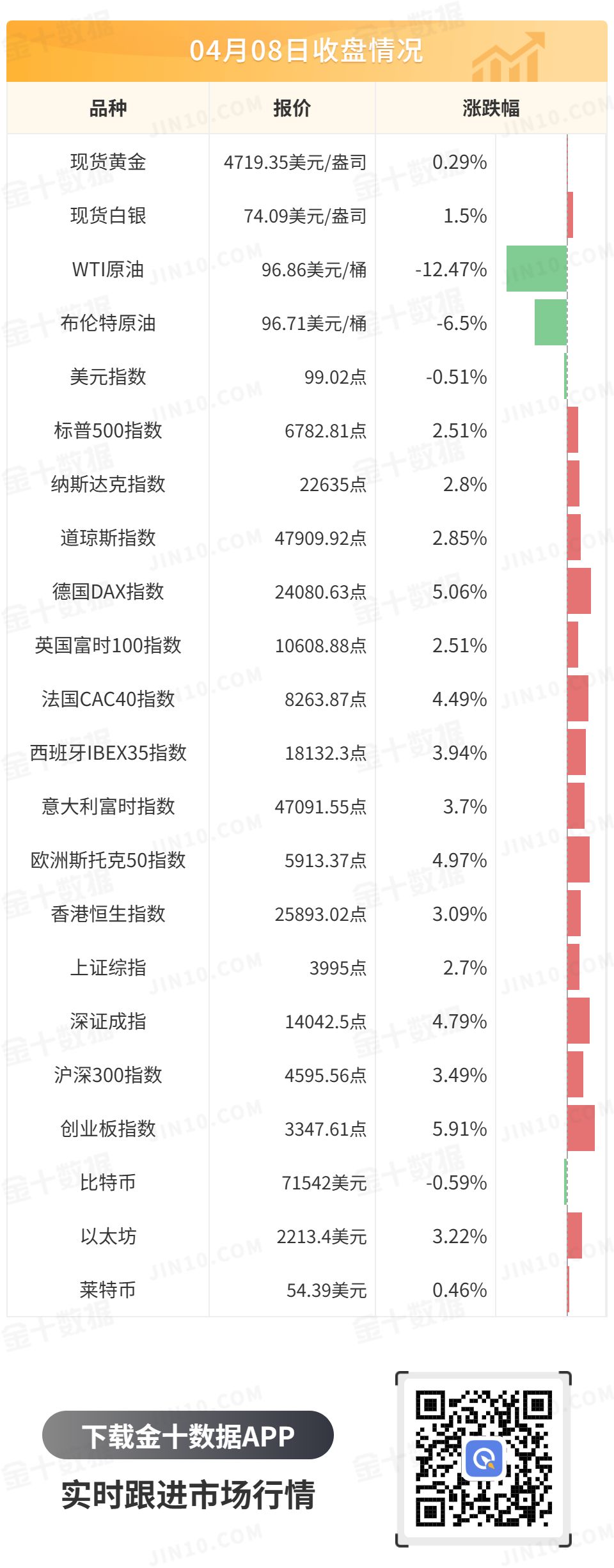 欧洲主要股指全线收涨,德国DAX30指数收涨5.06%,英国富时100指数收涨2.51%,法国CAC40指数收涨2.1%,欧洲斯托克50指数收涨4.49%。