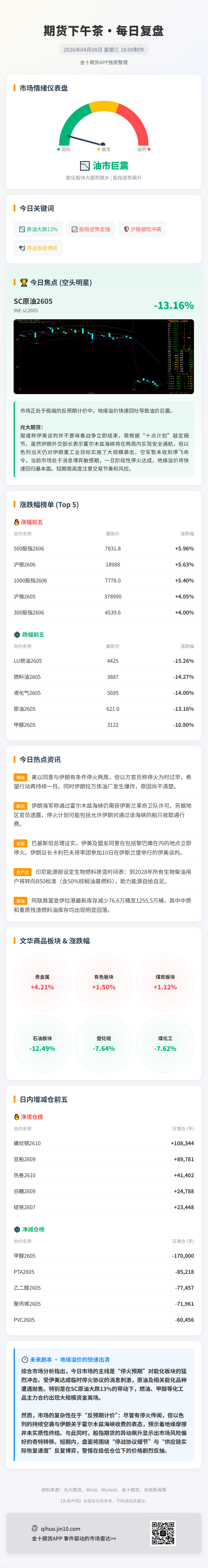 光大期货研报指出,报道称伊朗与美国谈判不意味着结束战争,只有在根据伊朗提出的“十点计划”敲定细节后,才会接受战争结束。声明强调,谈判达成的所有协议将成为具有约束力的国际法,并为伊朗民族带来一项重要的外交胜利。伊朗外交部长阿拉格齐八日凌晨代表伊朗最高国家安全委员会宣布,霍尔木兹海峡将在两周时间内实现安全通航。此外,以色列空军暂未收到停飞命令大规模袭击伊朗重工业目标,据以色列空军消息,以色列当天对伊朗重工业目标实施了大规模袭击,以空军暂未收到政府关于中止飞行计划的命令。当前来看,市场正处于反预期计价中,造成油价的巨震,需要注意的是,一旦阶段停火达成,市场的地缘溢价将快速回归,并重新评估市场基本面的影响。短期需要注意节奏和风险。