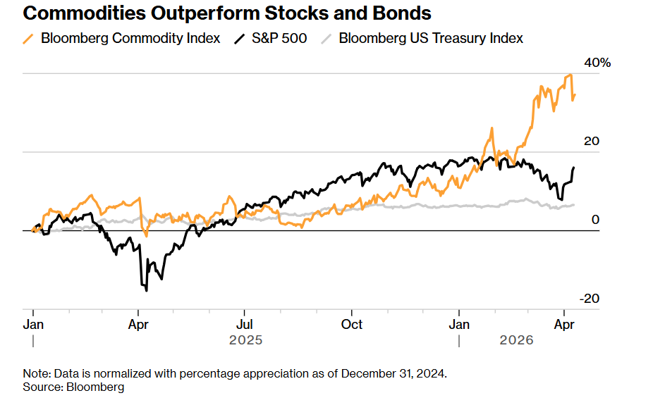 自2025年初以来,彭博大宗商品指数已累计上涨35%,涨幅是同期标普500指数的两倍以上,而美国国债收益率涨幅不足7%。尤其是原油,在伊朗因战争爆发封锁霍尔木兹海峡大部分航运后年内大幅走高;黄金、白银、铜等金属也早已受益于央行购金与AI基建热潮。